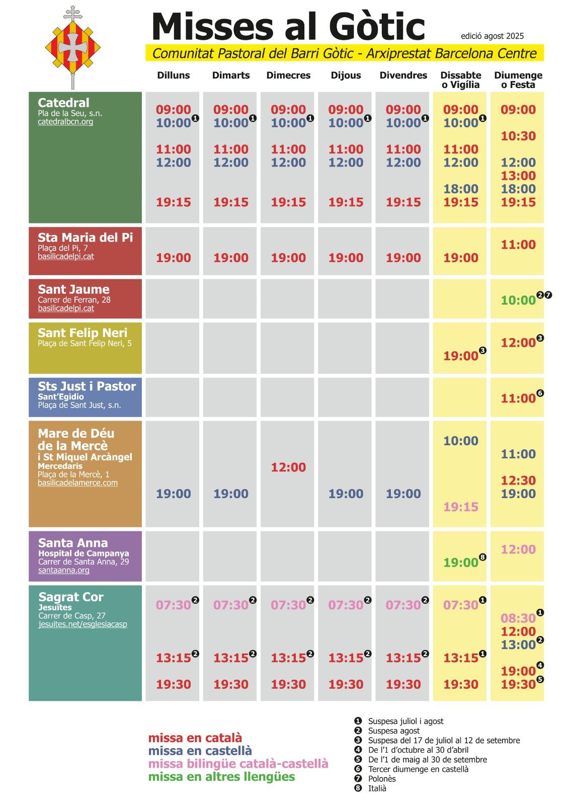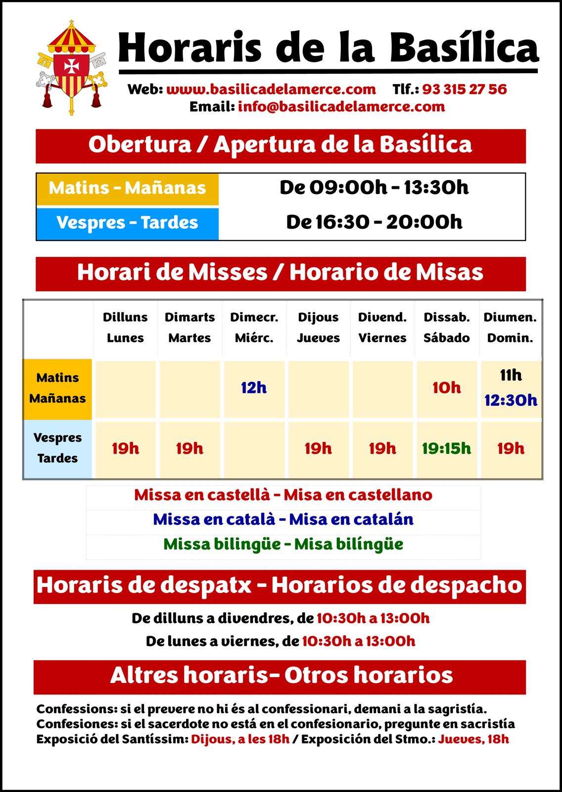 Horaris de Misses: Dilluns, dimarts, dijous, divendres: a les 19,00 h. Dimecres, a les 12,00 h. Dissabtes: 10,00 hi 19,15 h (bilingüe). Diumenges: 11,00h (castellà); 12,30h (català) i 19,00h (castellà).